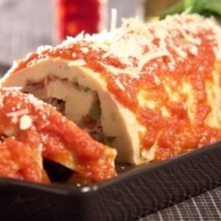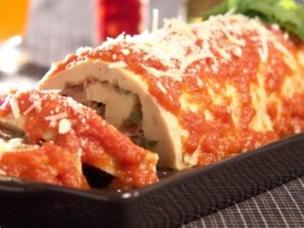 Quando a massa estiver assada, desenforme sobre um pano úmido. Espalhe o recheio e enrole. Regue com o molho de tomate e salpique o parmesão. Sirva em seguida.