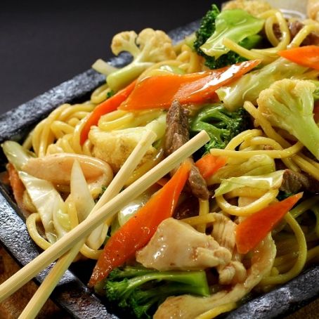Em uma panela coloque o alho, a cebola ralada, o óleo de gergelim torrado, o shoyu, misture e acrescente o amido de milho dissolvido na água, engrosse, em seguida vá acrescentando os vegetais, misture e reserve.