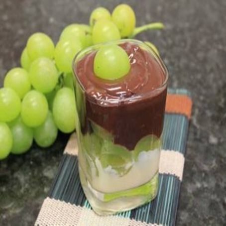 Derreta o chocolate em banho-maria, espalhe delicadamente sobre o creme do refratário e decore com as uvas cortadas ao meio (empurre até a metade)
