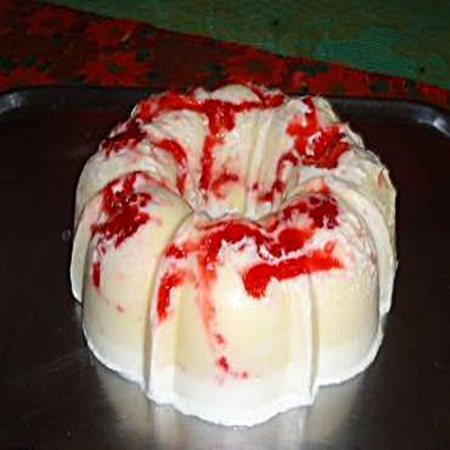 Em uma forma coloque a cobertura de morango, o creme e depois a cobertura das claras