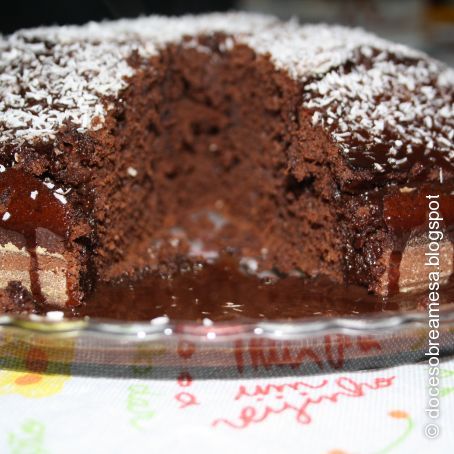 Como dobro a receita, uso um prato um bocadinho fundo, para que a calda fique à volta do bolo.