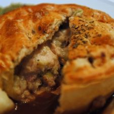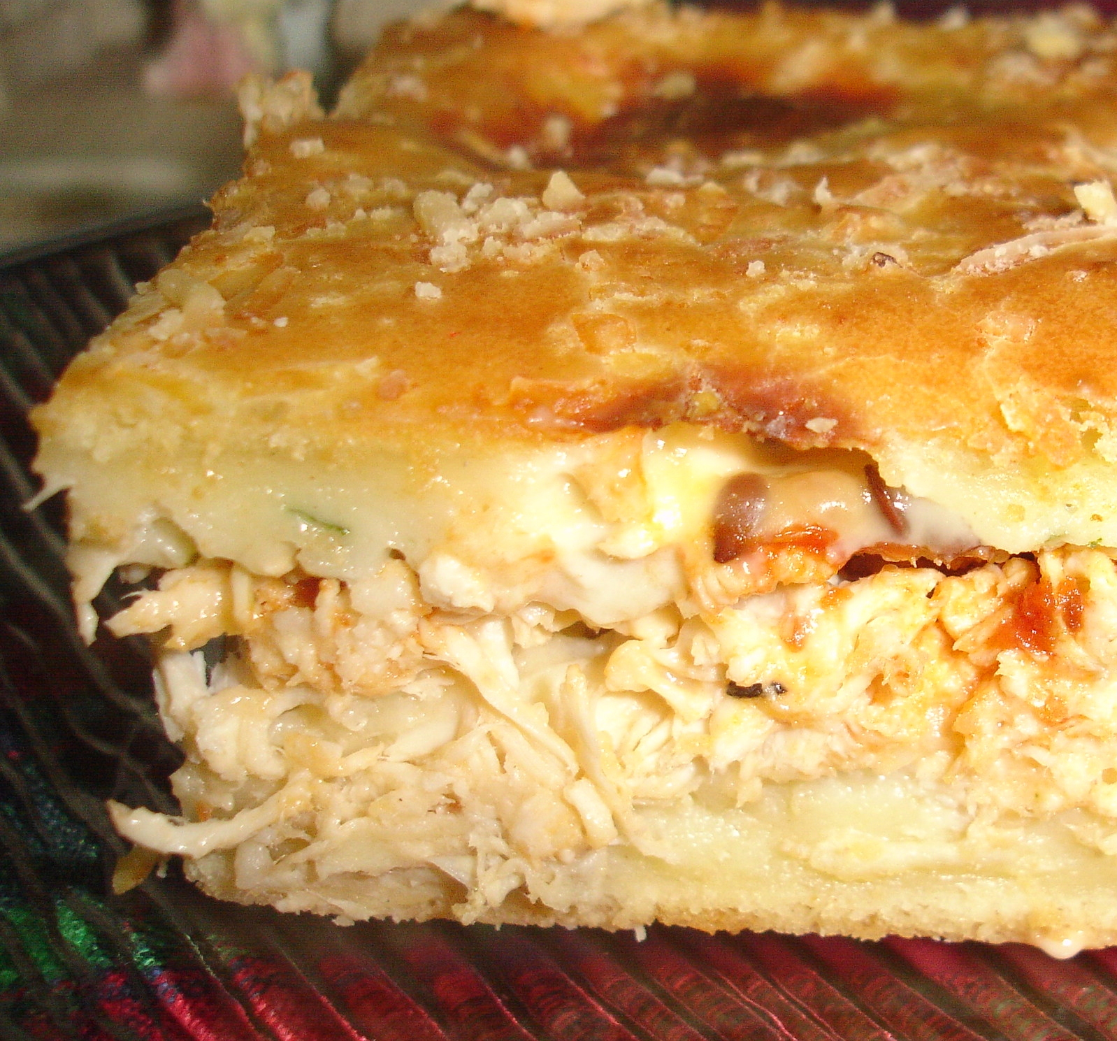 Uma torta de frango crocante por fora e macia por dentro.