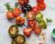 espalhe todos os ingredientes por cima da massa, menos a calabresa e o tomate.