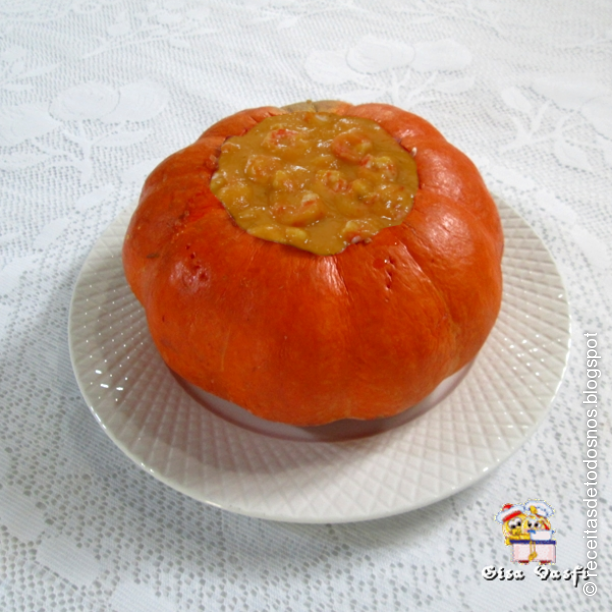 Espalhe o requeijão no fundo da moranga e despeje o creme de camarão.