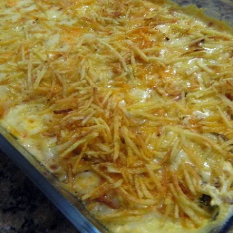 Numa travessa, coloque a carne, a azeitona, a batata palha e o molho batido