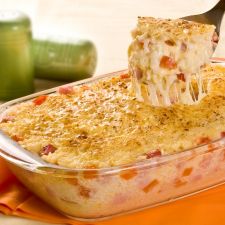 Em um refratário faça uma camada de arroz, uma de requeijão e uma de molho e repita novamente a mesma sequência, terminando com a última camada de arroz.