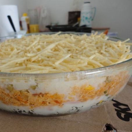 Sobre as camadas prontas, espalhar a batata palha e o queijo ralado