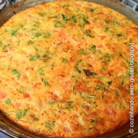 Primeiro liquidifiquei o ovo, o leite, o azeite, a cebola, o alho, o sal e a pimenta. Acrescentei as farinhas e bati até formar um creme homogêneo. Por último adicionei o fermento e misturei com uma colher sem bater. Juntei a essa massa o recheio e misturei tudo.