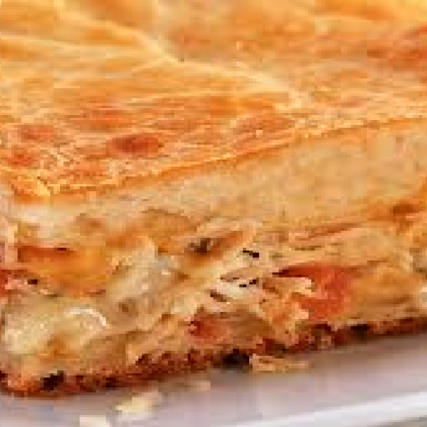 Na hora de montar, pegue um refratário untado e polvilhado com farinha de trigo, coloque a metade da massa, cubra com todo o recheio
