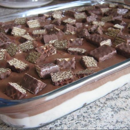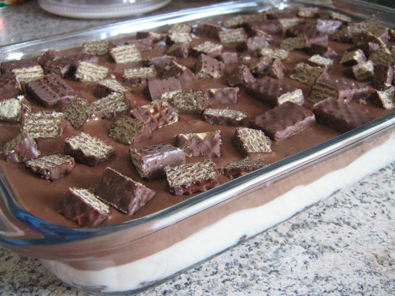 Montagem: Umedeça os biscoitos waffer no leite, forre uma tigela e, em seguida, cubra com o creme branco. Sobre o creme branco coloque 1 caixa de bis picado e cubra com o creme de chocolate. Pique metade de 1 caixa de bis, cubra o creme de chocolate e com a outra metade da caixa de bis decore a seu gosto. Leve à geladeira por 2 horas e sirva.