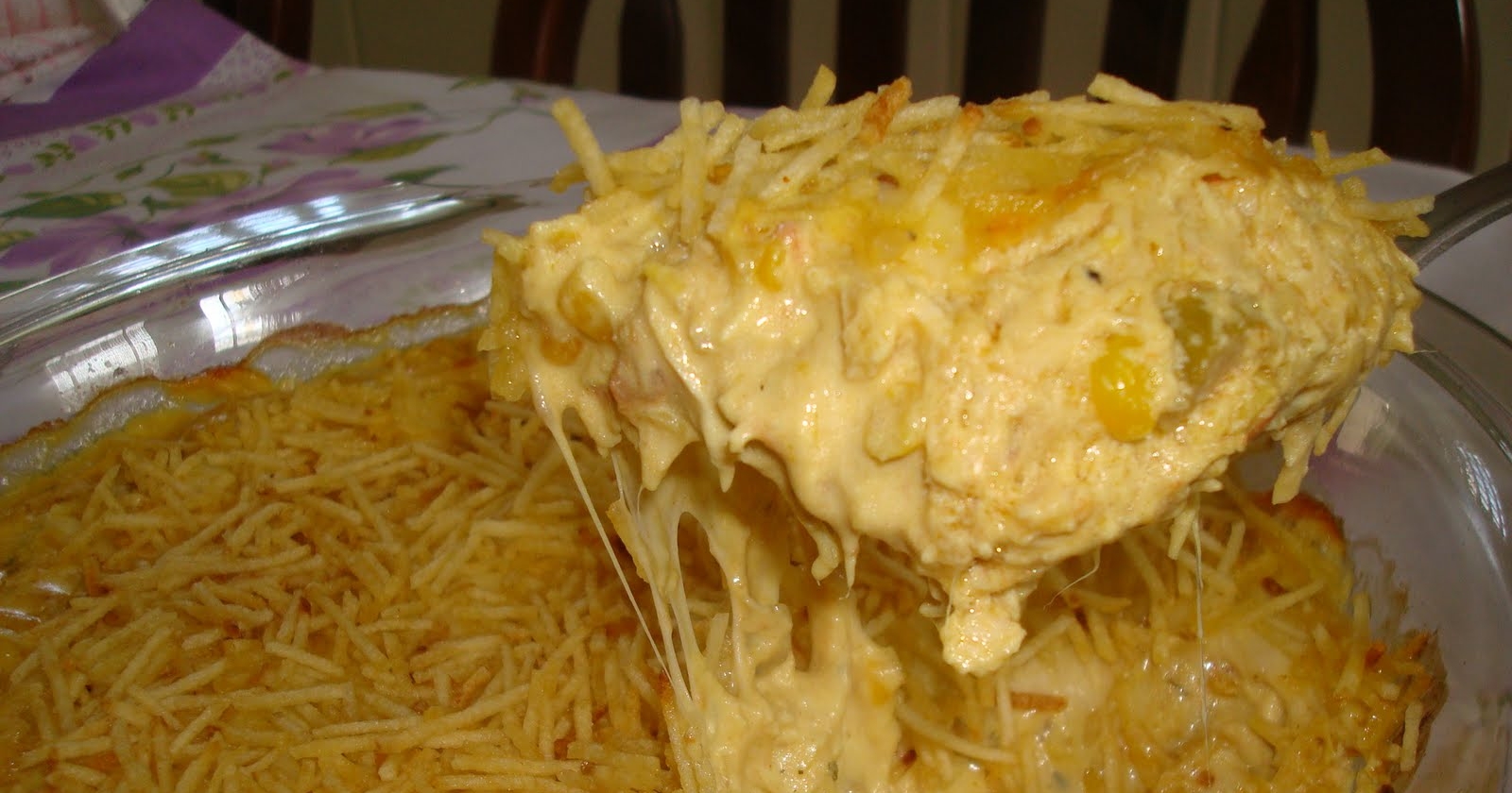 Coloque o refogado numa assadeira, cubra com mussarela e espalhe a batata palha por cima