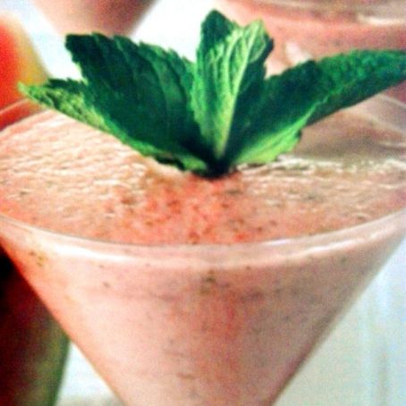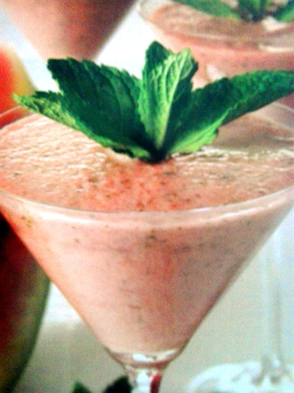 No liquidificador bata a polpa de melancia, o iogurte natural, o açúcar e a hortelã.