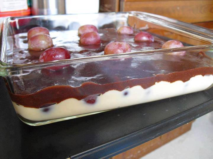 Coloque na travessa, e acrescente as frutas em cima do creme