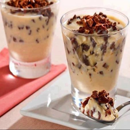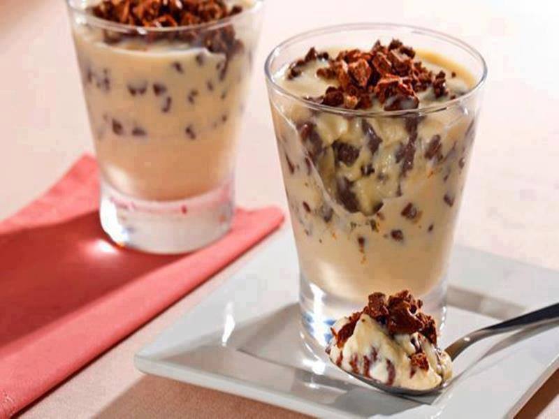 Em um refratário ou em taças individuais, alterne camadas de creme e camadas de chocolate picado.