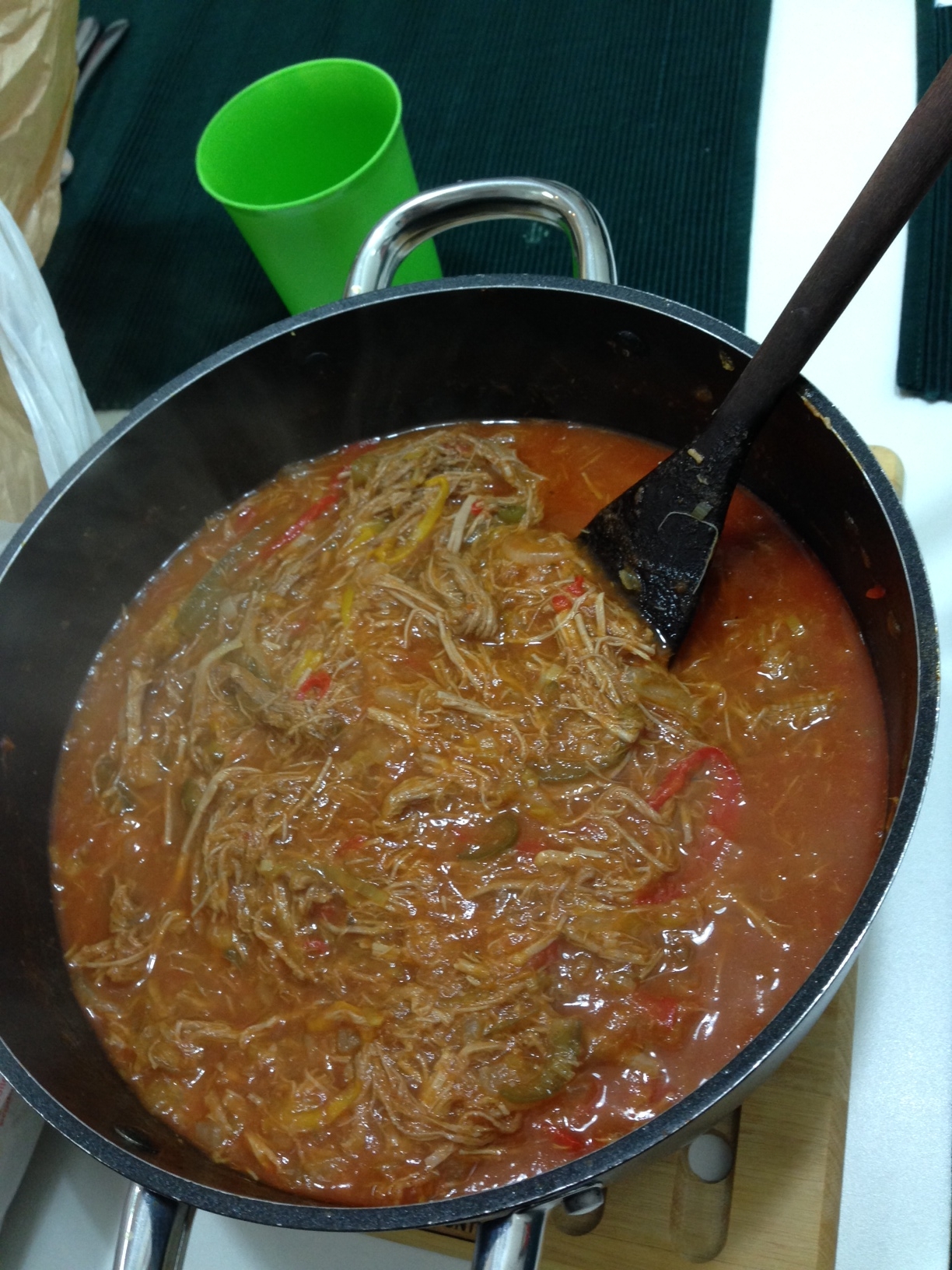 Junte, no refogado de legumes, o caldo que sobrou do cozimento da carne e a própria carne já desfiada.