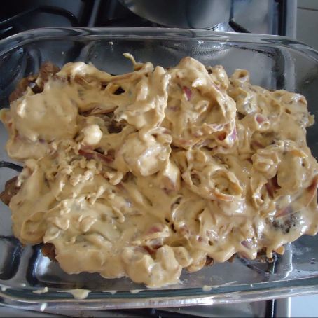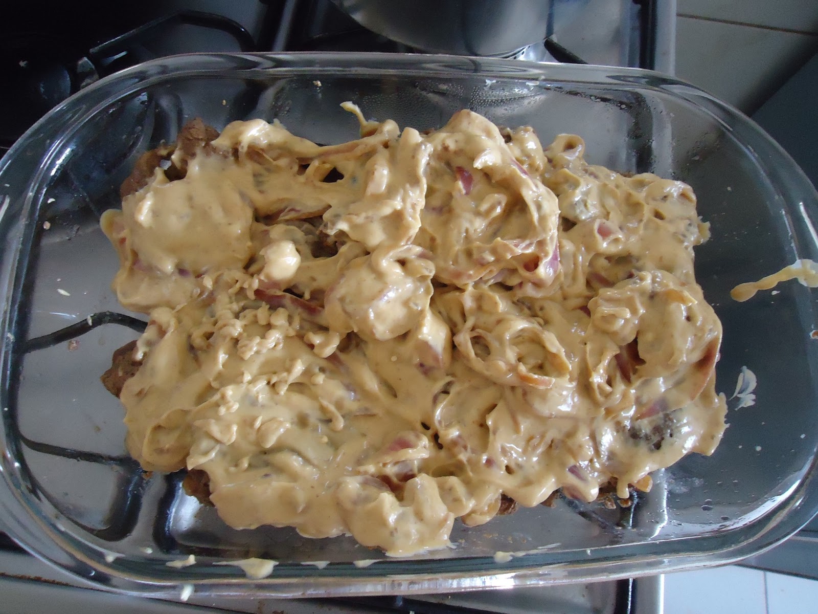 Acrescente em cima dos bifes o creme com as cebolas e está pronto