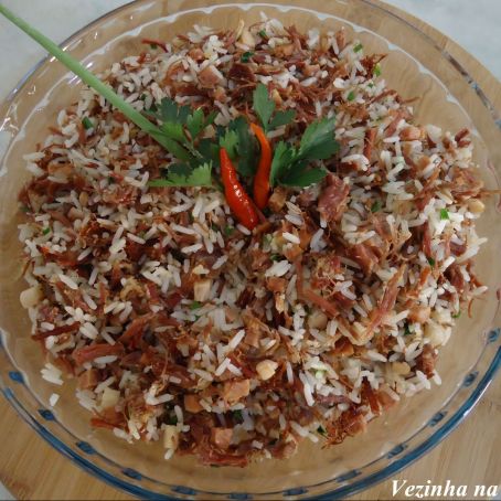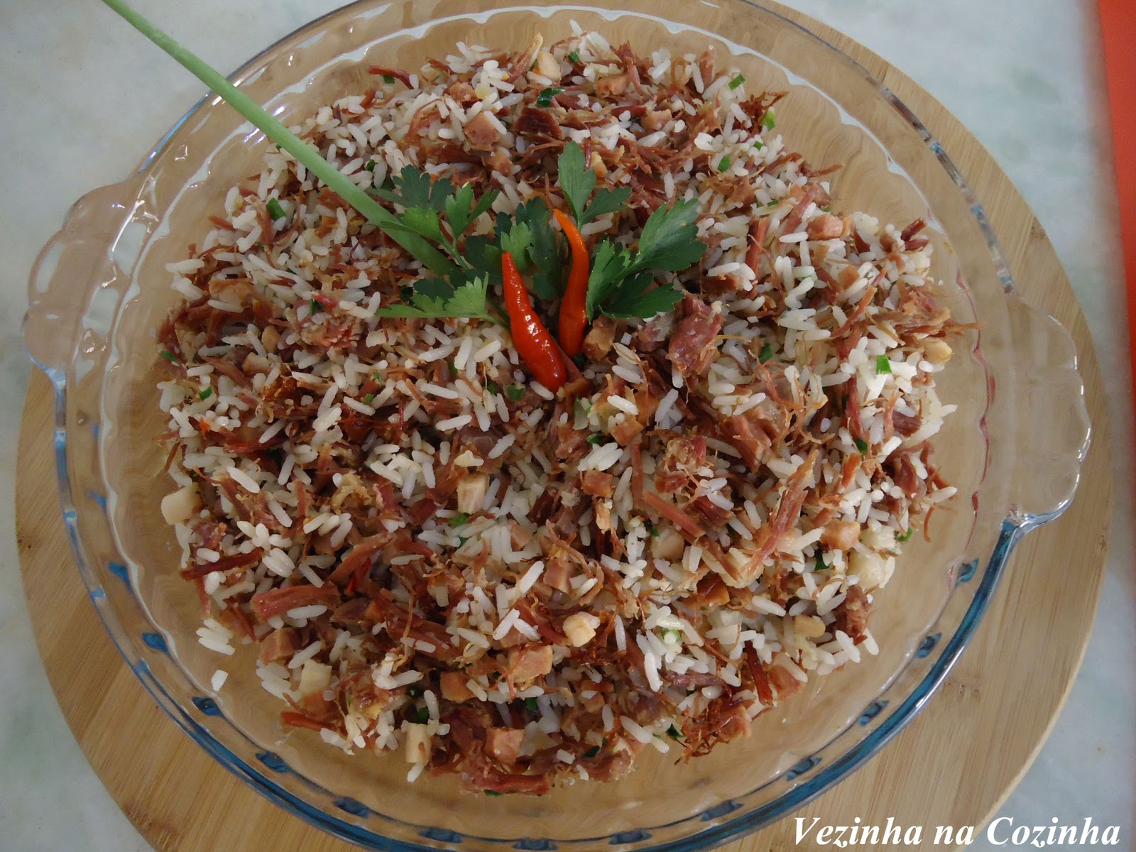 Pique a carne seca em pedacinhos, leve ao fogo com água para duas fervuras (para retirar o excesso de sal)