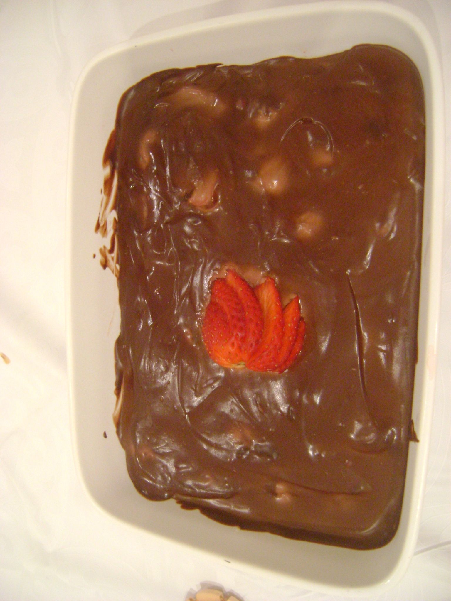 Pique o chocolate e derreta em banho-maria. Depois de derretido misture o conteúdo da outra lata de creme de leite sem soro e misture bem – parecido com o processo de trufar o chocolate. Coloque este chocolate por cima dos morangos, e, para finalizar e dar aquele charme coloque uns morangos por cima para decorar. Leve a deladeira por umas duas horas e meia ou três horas.
