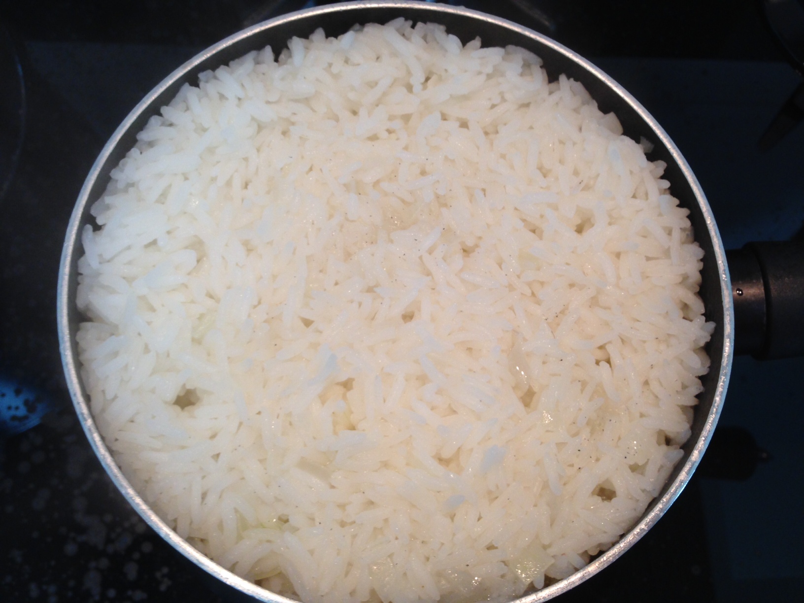 Nesse momento, acrescente o restante da água (ainda fervendo), sem mexer mais o arroz, e continue o conzimento com a tampa parcialmente fechada até quase secar o arroz.