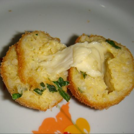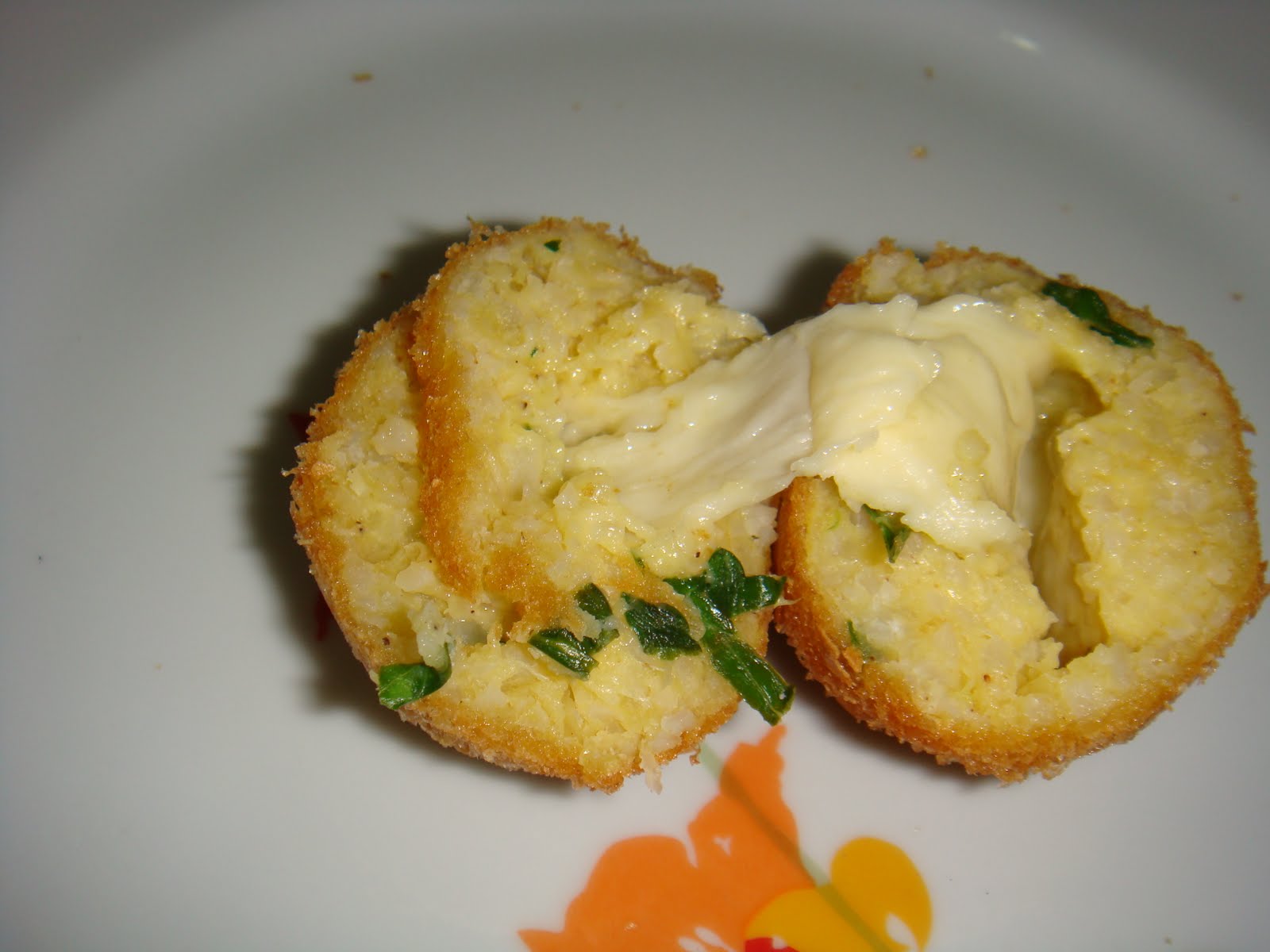 Faça os bolinhos e recheie com os cubos de queijo. Pode usar duas colheres para ajudar a dar forma nos bolinhos