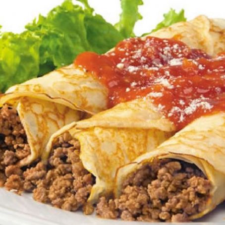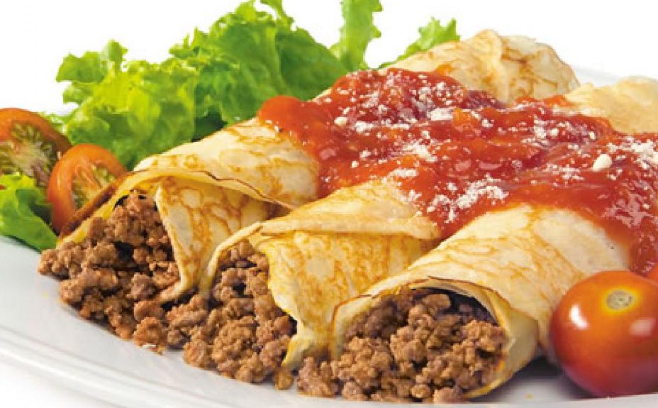 Pegue as panquecas, coloque uma fatia de mussarela e uma porção de carne e enrole