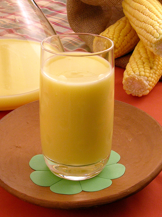 Bata no liquidificador, o milho, 3 xícaras de leite, 1 1/2 xícara de água, e o açúcar
