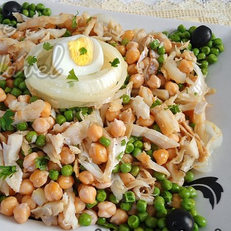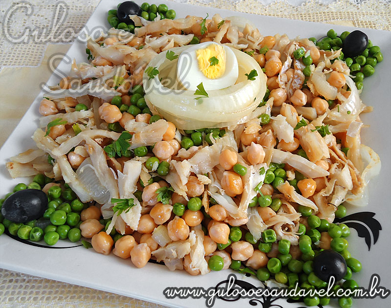 Em um refratário vá formando camadas com bacalhau, grão de bico, os tomates, as cebolas e as azeitonas