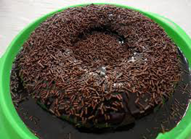 Cubra o bolo com a cobertura e salpique o chocolate granulado;