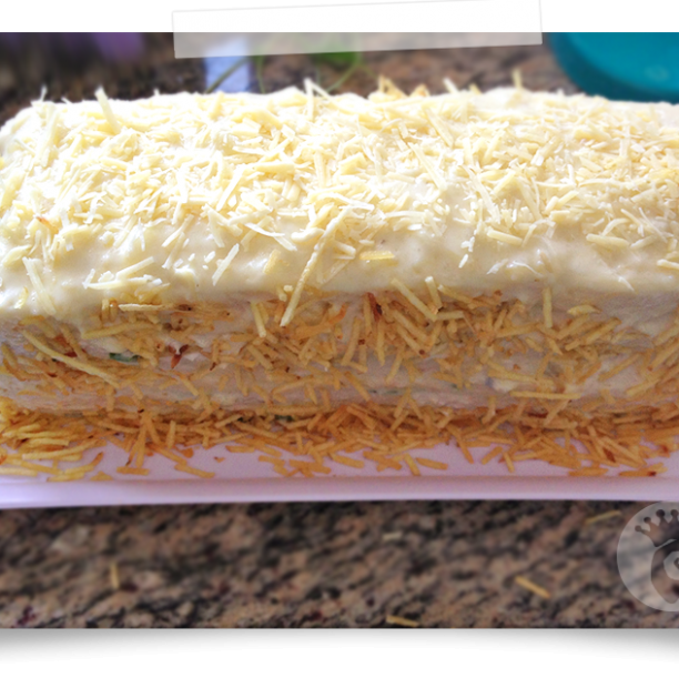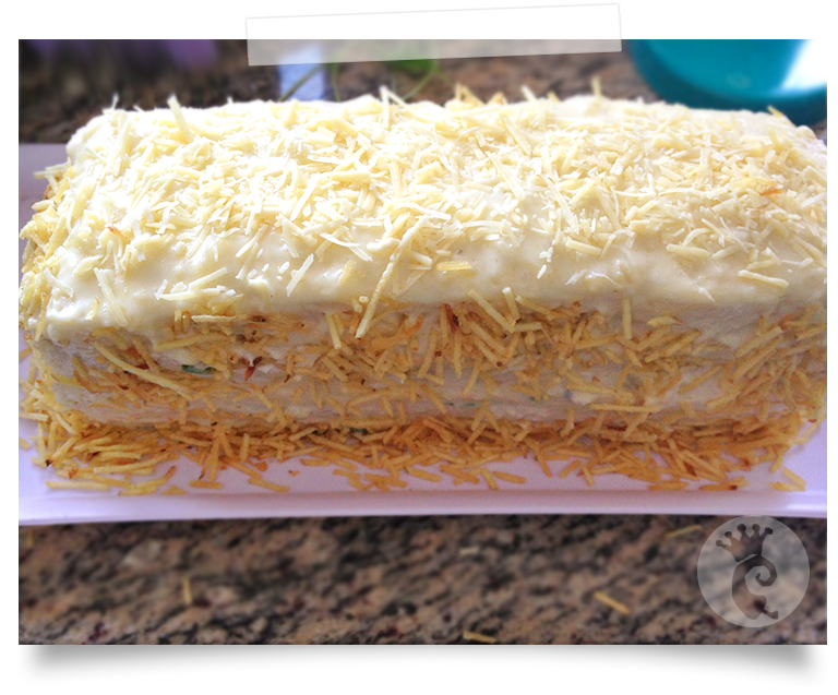 Para a cobertura faça um purê de batata com duas conchas do creme juntamente com a margarina, cubra toda a torta e salpique a batata palha para cobrir em cima e dos lados