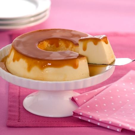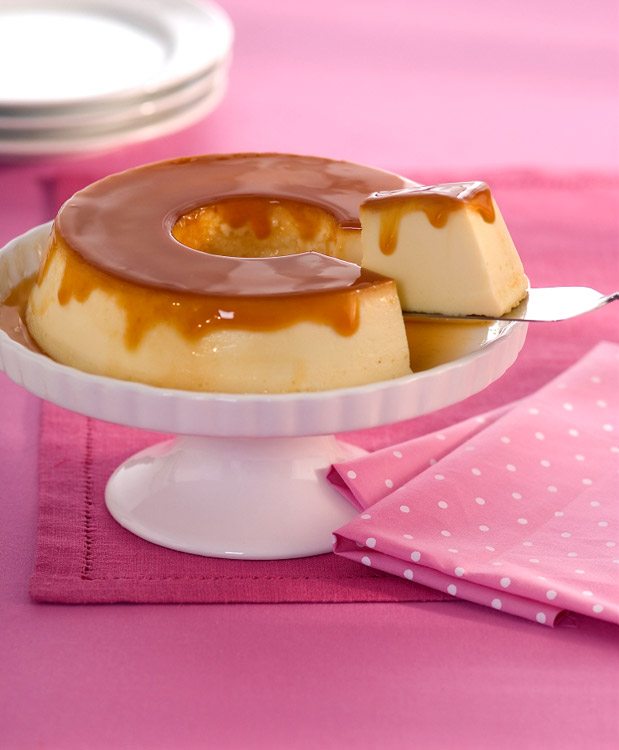 Calda: em uma panela de fundo largo, derreta o açúcar até ficar dourado. Junte meia xícara (chá) de água quente e mexa com uma colher de cabo longo. Deixe ferver até dissolver os torrões de açúcar e a calda engrossar. Forre com a calda uma forma com furo central (19 cm de diâmetro) e reserve.
