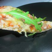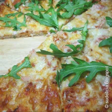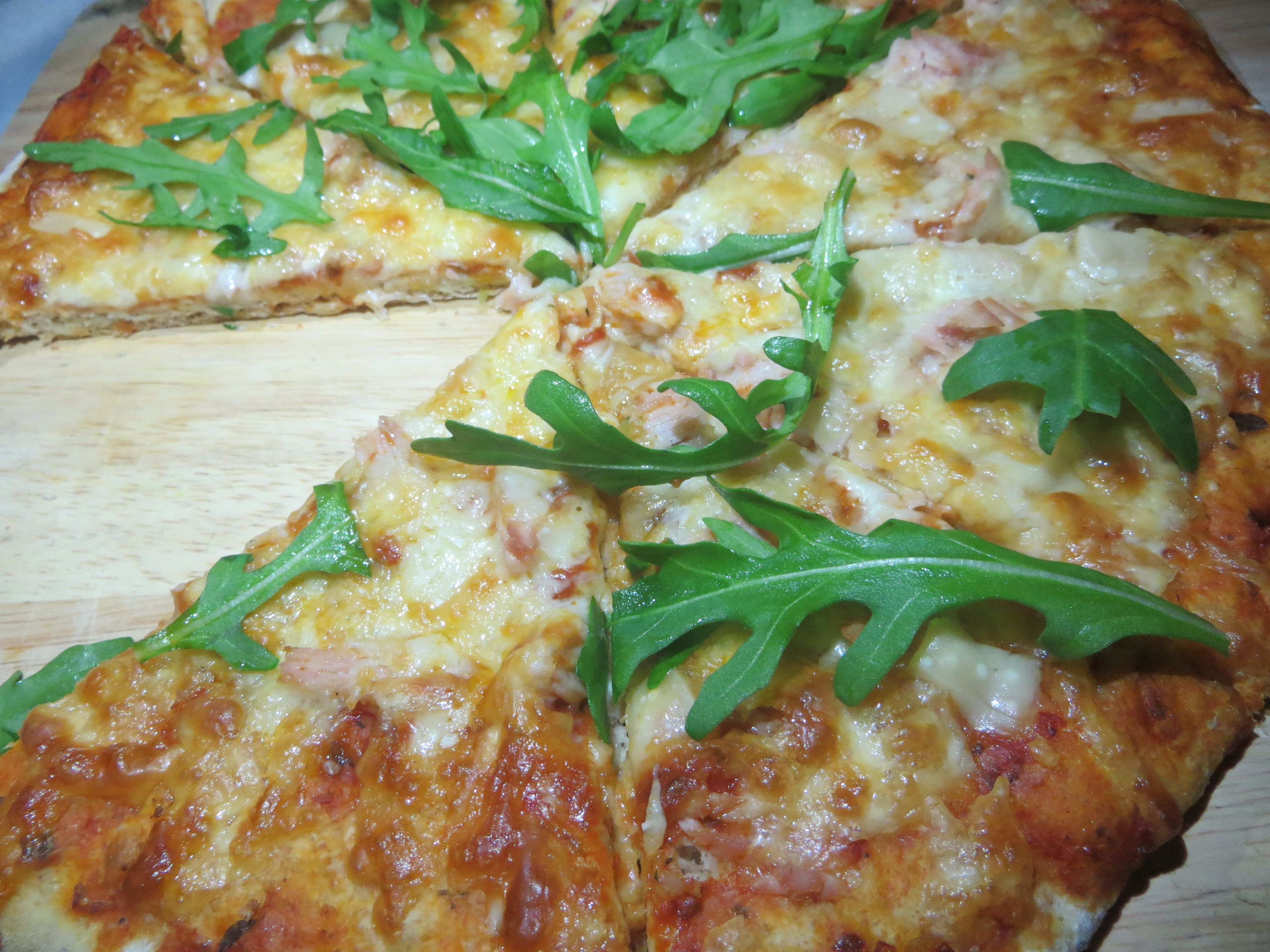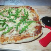 Estenda metade da massa com um rolo da massa (enfarinhado para não colar) até ficar bem fina espalhe o refogado da horta e coloque um pouco de queijo mozarella por cima. Espalhe o fiambre cortado em tiras e coloque o queijo mozarela e o queijo parmazão ralado por cima e leve ao forno até a massa cozer e o queijo derreter. Retire do forno e espalhe rúcula por cima... e Repita o processo para o segundo pedaço de massa!
