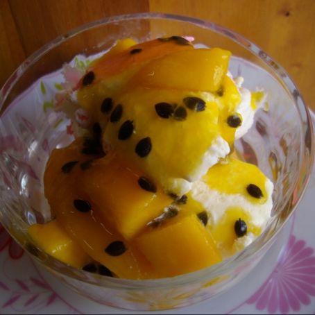 Coloque a polpa de maracujá, a água e o açúcar em uma panela e no fogo baixo, deixe ferver mexendo sempre até reduzir e a calda ficar um pouco mais espessa. Apague o fogo e coloque os pedaços de manga.