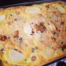 Bater duas claras em neve, juntar com as gemas e espalhar por cima. Polvilhar com parmesão e levar ao forno para gratinar.