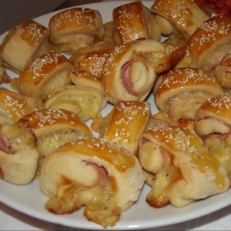 Depois abra a massa e recheio com uma fatia de queijo e outra de presunto