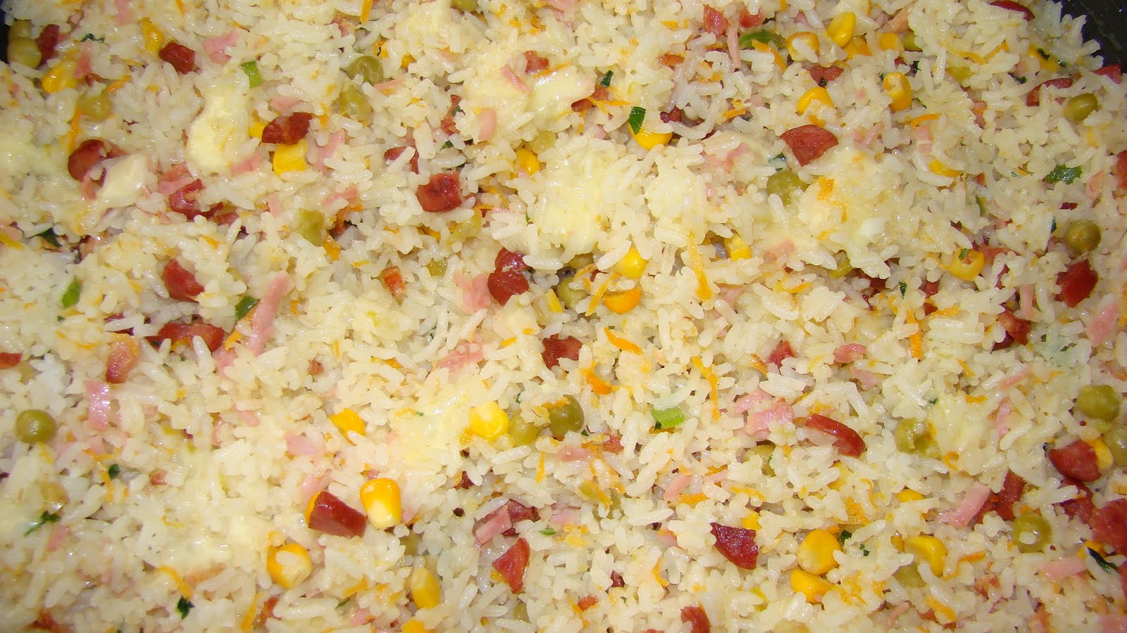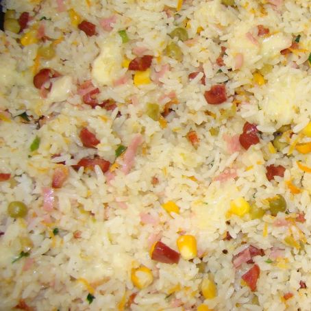 Retire o bacon e na gordura que se formou refogue a cebola o alho e o milho, o brócolis, a ervilha e o frango. Tempere com sal, pimenta e misture o arroz. Desligue o fogo e misture o tomate e o bacon reservado. Transfira para um refratário médio e espalhe os cubos de queijo, afundando no arroz. Em uma panela, aqueça a manteiga, dissolva o caldo de legumes, despeje a água e regue o arroz. Cubra com Mussarela e leve ao forno médio, preaquecido, por 10 minutos ou até gratinar.