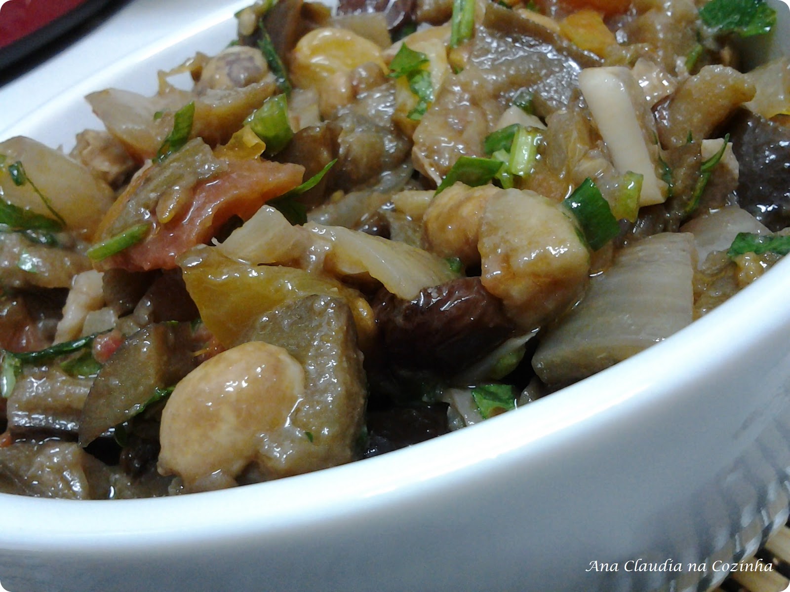 Em uma panela de pressão coloque os cubos de berinjela, azeite, orégano, folha de louro, 1 cebola em cubos, alho amassado