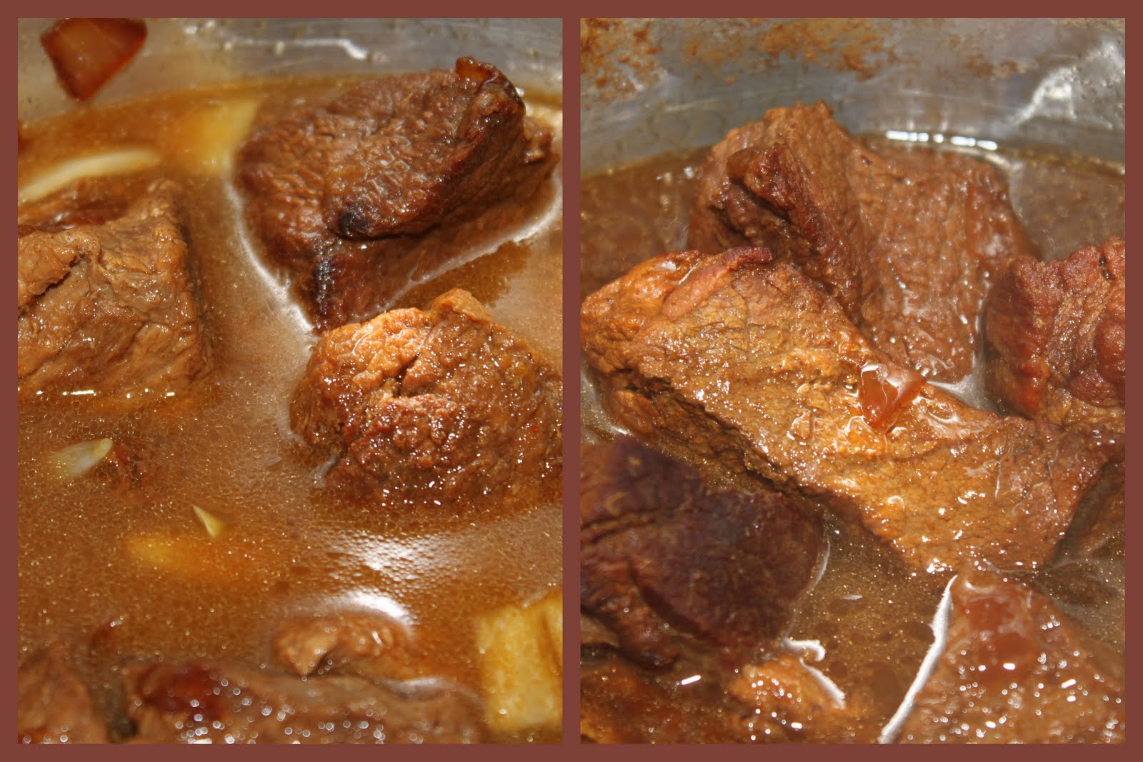 Fechar a panela de pressão, sem adicionar água, deixar mais ou menos uns 25 minutos, abrir a panela, verificar se a carne está mole, senão deixar mais uns 10 minutos
