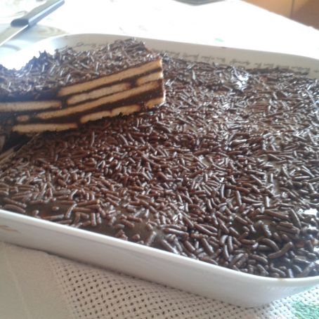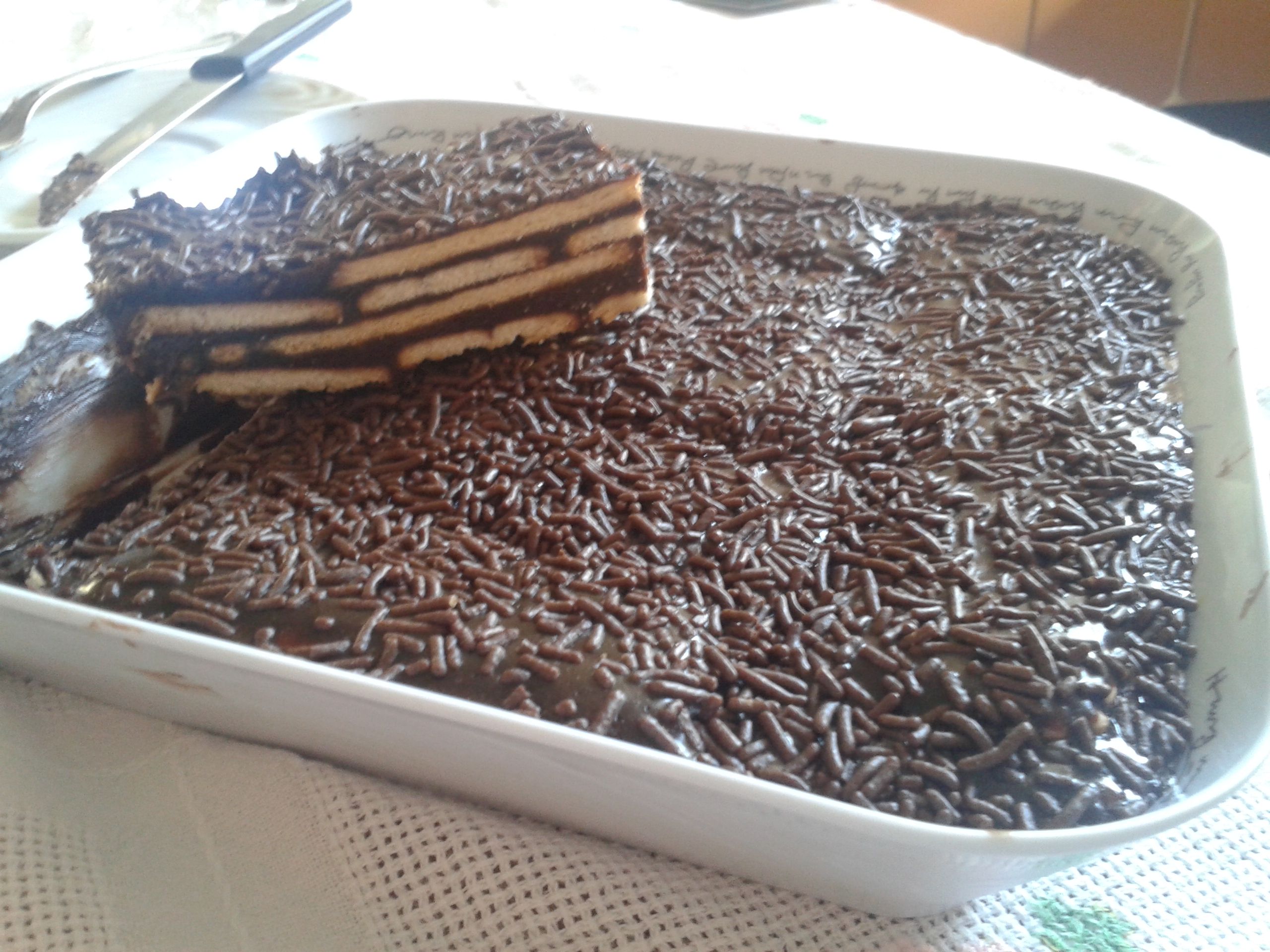 Em um refratário, alternar uma camada de bolacha com uma camada de creme de chocolate.