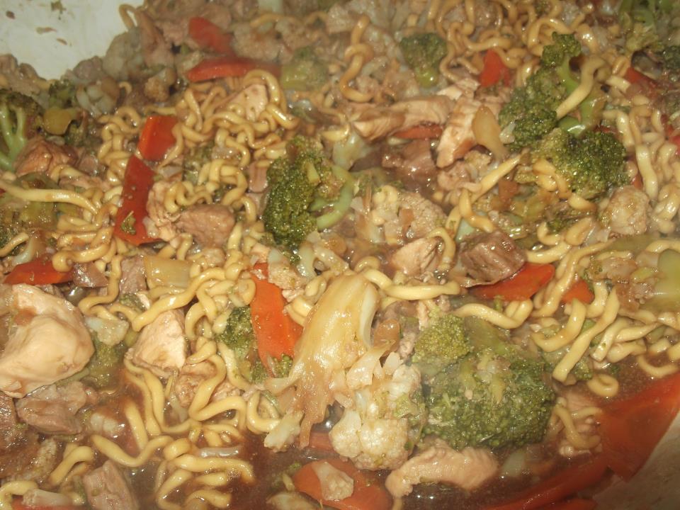 E rapidamente, acrescente a carne, o brócolis, a couve-flor, a cenoura, a acelga e o champignon temperando com shoyu