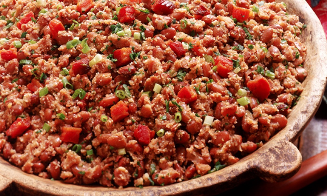 Acrescente o feijão escorrido e a pimenta malagueta e vá mexendo bem devagar, para ele não amassar. Coloque o ovo cozido e mexa. Acrescente a farinha e a cebolinha picadinha e mexa. Pronto!! Agora salpique o torresmo por cima e sirva.
