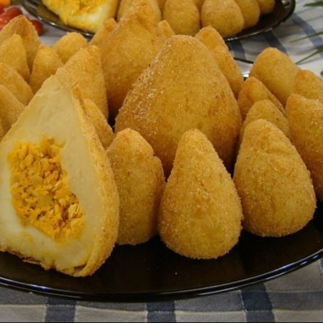 Modele as coxinhas, empane passando na clara batida com água e depois na farinha de rosca