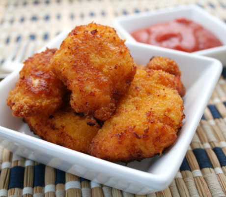 Frite em óleo (não muito quente para n queimar só por fora) e em quantidade suficiente para cobrir o nuget .