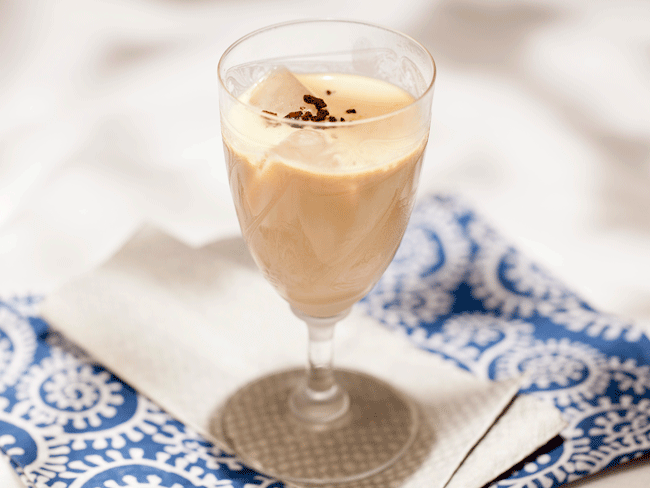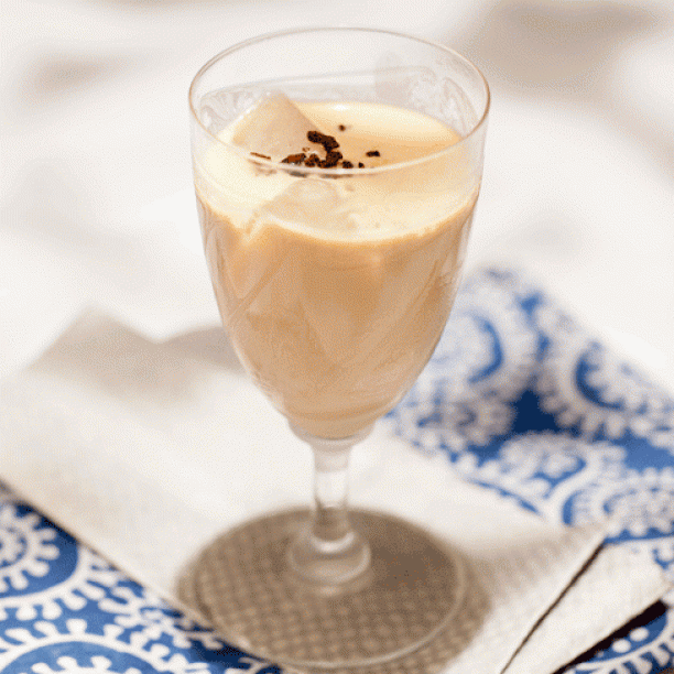 Coloque todos os ingredientes numa coqueteleira e agite fortemente. Coe numa taça, polvilhe café solúvel por cima e sirva imediatamente.