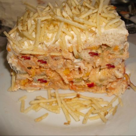 Acrescente o frango desfiado por cima e, depois, o creme branco.
