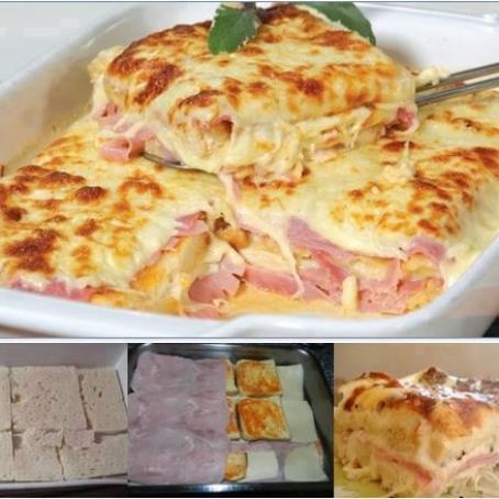 Forre uma travessa refratária com uma camada de pão e espalhe o molho, seguido por fatias de presunto e queijo. A ultima camada deverá ser de queijo para gratinar.