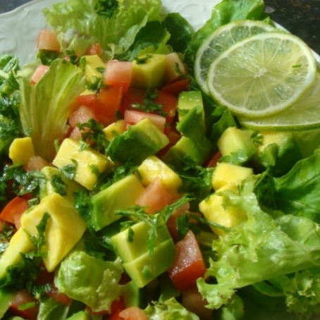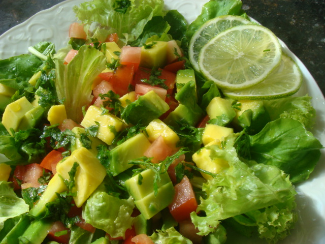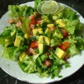 Lave as folhas de rúcula e alface, corte as mãos. Corte os tomates, a cebola e o abacate em cubinhos. Pique bem o coentro e a salsinha. Arrume tudo num prato tempere com o limão, azeite, sal e pimenta e está pronta para ser servida. Se quiser decore a com fatias finas de limão.