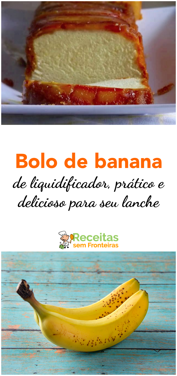• Ingredientes: 3 ovos, 2 xícaras de chá de açúcar, 1 xícara de chá de leite, 1/2 xícara de chá de óleo, 2 xícaras de chá de farinha, 1 colher de sopa de fermento em pó, 4 bananas grandes.