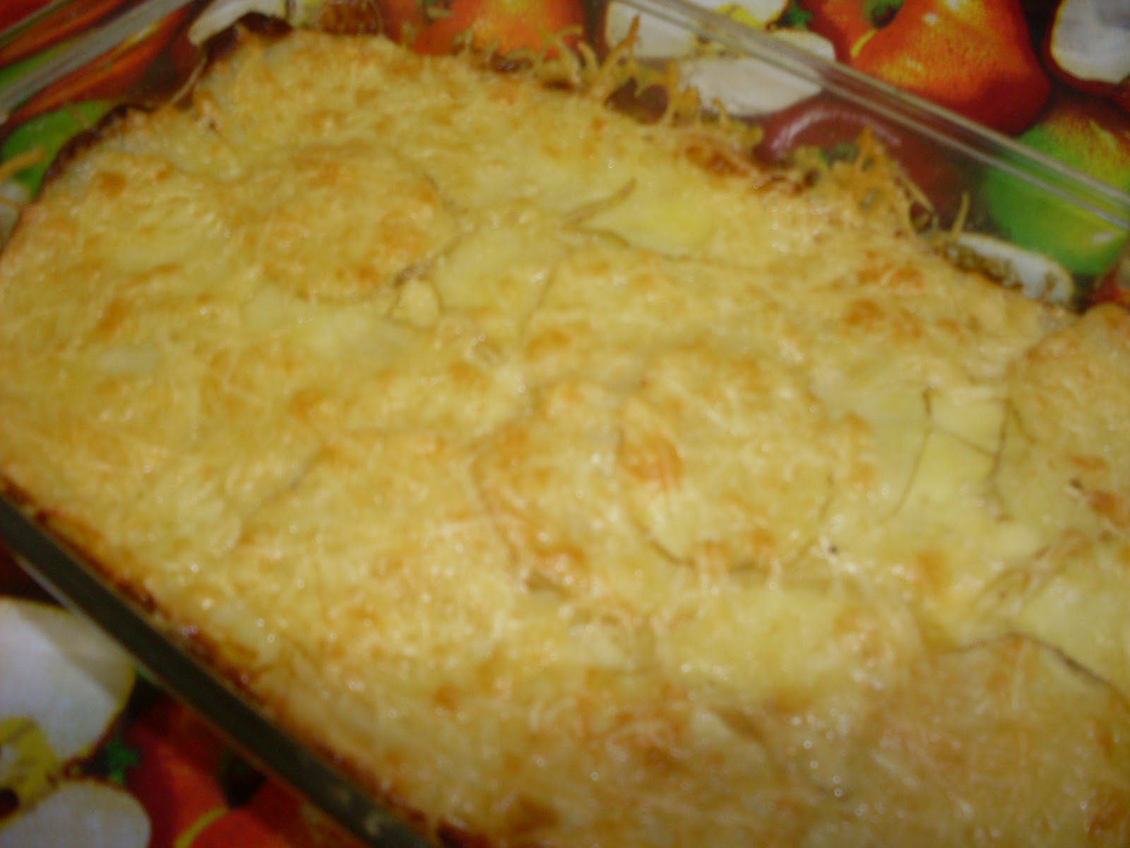 Depois de cozidas as batatas coloque em um refratário, intercalando entre o recheio e o molho