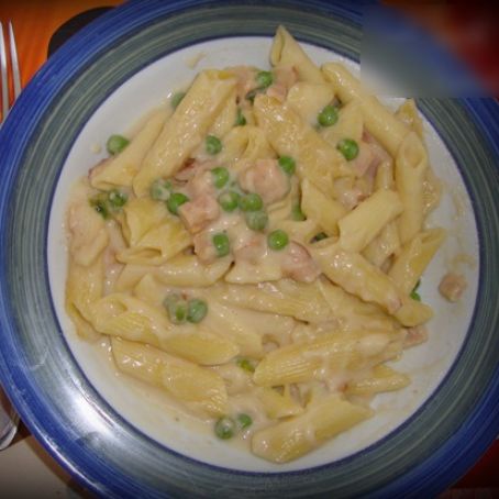 Em uma frigideira acrescente o óleo, a cebola e a manteiga e refogue sem deixar dourar. Acrescente o presunto picado, e o champignon. Misture o molho branco e as ervilhas e deixe aquecer bem, Misture o molho à massa, e sirva imediatamente.