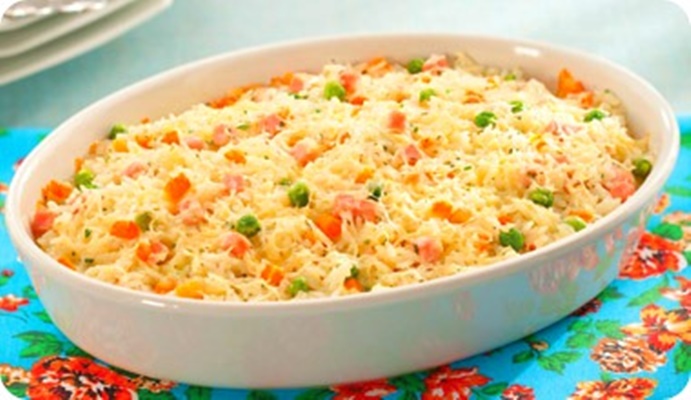 6.Em uma tigela média, coloque o arroz reservado, junte o tomate, o manjericão, o peito de peru, o queijo, os ovos e metade da mussarela. Misture e coloque no refratário reservado. Polvilhe o restante da mussarela e leve ao forno por 15 minutos.